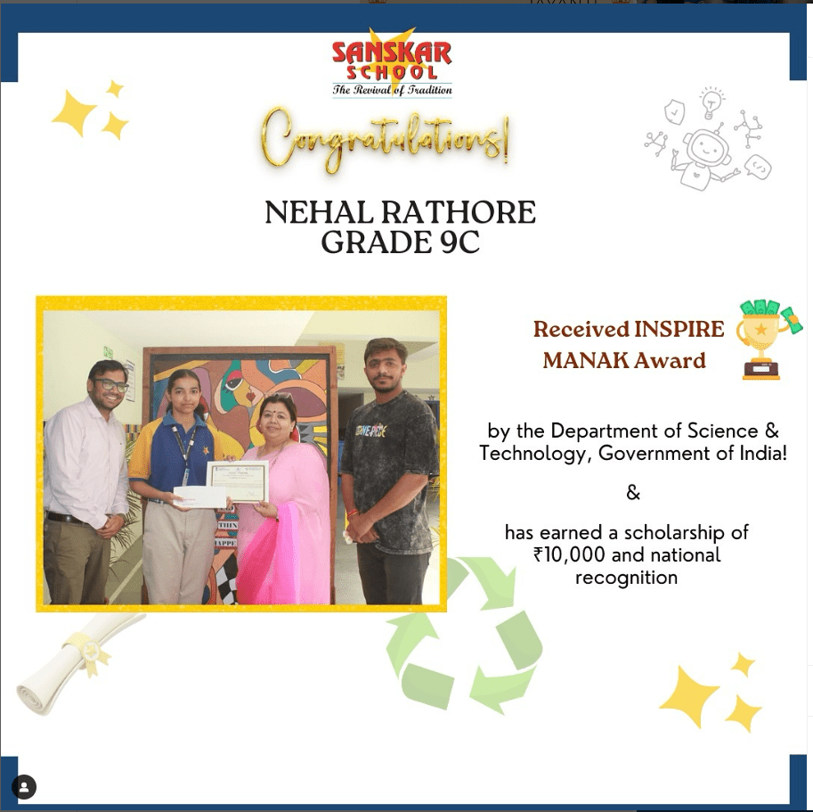 We’re thrilled to share that Nehal Rathore of Class IX C has been selected for the prestigious INSPIRE MANAK Award by the Department of Science & Technology, Government of India!