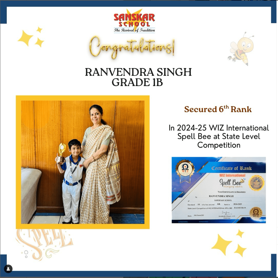 A big congratulations to Ranvendra Singh of Grade 1B for securing 6th Rank at the 2024–25 WIZ International Spell Bee – State Level Competition!