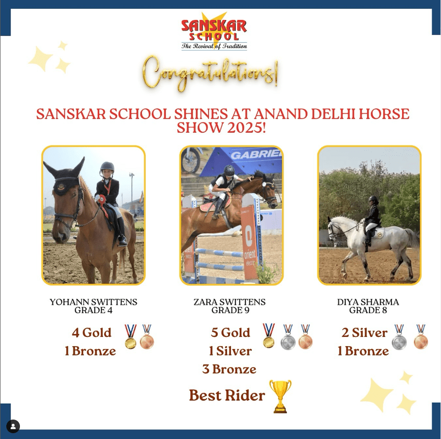 Sanskar School shines at the Anand Delhi Horse Show 2025! Our young equestrians brought home 9 Gold, 3 Silver, and 5 Bronze medals in Show Jumping and Dressage.