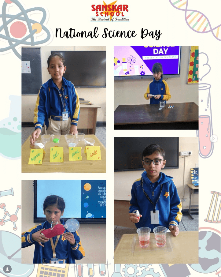 The school buzzed with scientific explorations and inquiry both inside and outside the classrooms as Sanskar School celebrated National Science Day on 28 February 2026 with great enthusiasm. The occasion commemorated the discovery of the Raman Effect by C. V. Raman, inspiring young minds to explore the power of scientific inquiry. Through engaging experiments and interactive learning experiences, students discovered that science is not just a subject—but a way of thinking.